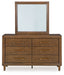 Details B615B2: Includes upholstered panel headboard and footboard , Solid wood frame, Due to the use of natural wood materials, some variations may occur , Frame with medium brown wood tone finish, Polyester upholstery, Tapered legs, Foundation/box spring required, sold separately , Mattress available, sold separately, Assembly required, B615B1: Includes dresser and mirror, Made with hardwood solids, mango wood veneer and MDF substrates, Medium brown wood-tone finish, 6 drawers with fully finished interior, dovetail construction and heavy duty ball-bearing side glides, Round tapered legs, Mirror attaches to back of dresser, B615-46: Made with hardwood solids, mango wood veneer and MDF substrates, Medium brown wood-tone finish, 5 drawers with fully finished interior, dovetail construction and heavy duty ball-bearing side glides, Round tapered legs, B615-92: Made with hardwood solids, mango wood veneer and MDF substrates, Medium brown wood-tone finish, 2 drawers with fully finished interior, dovetail construction and heavy duty ball-bearing side glides, Round tapered legs, 110V power supply with USB-A and USB-C charging ports, Power cord included; UL Listed,