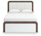 Looking to make a subtly striking statement in your bedroom? We've got you covered. This queen upholstered bed’s sophisticated two-tone treatment marries a warm brown finish over replicated walnut grain with a matte white finish. Highlighted with a wonderful white faux leather, the headboard features warm ambient lighting for that cozy feeling we all love at bedtime. Rounded corners radiate an air of modern panache. It’s a master class in contemporary yet comfortable character.