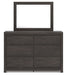 | Details | Includes dresser and mirror, Made with engineered wood (MDF/particleboard/plywood) and decorative laminate for the right balance of affordability and durability , Dark charcoal finish over replicated oak grain, Decorative laminate replicates natural or man-made material surfaces with consistent color, pattern and texture, Recessed hand grabs create hardware-less effect, 6 smooth-gliding drawers, Drawer interiors are lined with a faux linen laminate for a clean, finished look , Safety is a top priority, clothing storage units are designed to meet the most current standard for stability, ASTM F 2057 (ASTM International), Drawers extend out to accommodate maximum access to drawer interior while maintaining safety, Mirror attaches to back of dresser; can also be mounted on wall horizontally or vertically, Assembly required | |