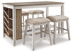 Raise the bar on small space living with this 5-piece counter-height dining set. An inspired choice for coastal chic or modern farmhouse settings, this strikingly simple table marries a brown tone plank-effect top with a rubbed-through grayish white base for timeworn appeal. The table’s side shelves and 8-bottle wine rack cleverly balance form and function while the comfortably cushioned bar stools serve up high style.
