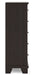 Details Made with hardwood solids, engineered wood veneer and MDF substrates, Dark brown finish, Metal bar pulls with bright nickel-tone finish, 5 smooth-gliding drawers with dovetail construction and metal center guides, Drawer interiors are lined with a wood grain laminate for a clean, finished look, Top moulding