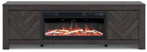 This TV stand with electric fireplace embraces a classically charming aesthetic and repurposes it for modern living. Its dark charcoal finish appeals to your love of vintage character, while a chic chevron pattern is effortlessly on trend. Media accessories stay tucked away in style thanks to hidden storage behind the doors. And for added ambiance, the electric fireplace brings a cozy-cool vibe to your living room. With the touch of a button, activate the LED-lit flame and adjust the temperature or the flame brightness. The flame effect includes multiple color options and a realistic-looking faux birch log set.