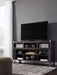 Make watching TV a joy. This TV stand's rustic-industrial style—with a gray finish, squared edges, zinc-tone corner bracket accents and nailhead detailing—is sure to complement any contemporary decor. Several vented open cubbies offer impressive shelf space, convenient for keeping all of your electronic gear within reach. Handy cutouts keep cords out of sight. The stand's large center opening accommodates a shelving insert (included) or an optional fireplace insert (sold separately).