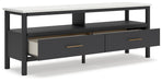 This TV stand reflects your sophisticated approach to boho style. Crafted with both form and function in mind, its replicated marble top beautifully contrasts a matte black finish. Ambient lighting and drawers for media storage make it a chic and convenient living room companion. And the versatile design suits all-neutral spaces or blends with your favorite pops of color. It’s inviting, yet posh. Luxe, yet laid-back. With this TV stand, your free-spirited vibe meets modern design.