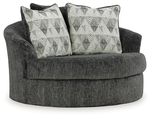 Appeal to your eye for ultra-contemporary design with this oversized swivel chair. Chic and sleek in dark neutrals, it pairs cozy fabric with faux ...