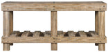 As this console table proves, sometimes less is more. Dramatically transform your living space with the warm and rustic appeal of solid wood construction and open-slat shelving. Washed in a light brown finish, this sofa table sets a new standard for down-to-earth refinement.