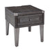 Take a stance for rustic-industrial style with this mixed material end table. Weather-washed pine wood and veneers are contrasted with canted metal legs and corner bracket accents for a uniquely chic merger of earthy beauty and contemporary flair. Power plug-ins and USB charging ports mounted on the back add practical function to great form.