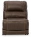 Details Includes left-arm facing power recliner, power armless recliner, console with storage, wedge, 2 armless chairs and right-arm facing power recliner, "Left-arm" and "right-arm" describe the position of the arm when you face the piece, One-touch power control with adjustable positions, Easy View™ adjustable headrest and zero-draw USB plug-in, Zero-draw technology only consumes power when the USB receptacle is in use, Zero-gravity mechanism allows optimum reclining comfort with infinite reclining positions at the touch of a button, Corner-blocked frame with metal reinforced seat; attached cushions; high-quality foam cushions wrapped in poly fiber, 100% top grain leather covers inside areas such as the back, seat and arm cushions; skillfully matched faux leather covers the remaining areas, Due to its natural origin, real leather can show individual characteristics such as healed scars, growth marks, grain variation and shade variation, Natural variations make each hide unique and do not detract from the wearing qualities of leather, Console with 2 cup holders and hidden storage, Extended ottoman for enhanced comfort, Zero wall design requires minimal space between wall and chair back, Power cord included; UL Listed