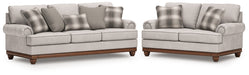 Fresh yet classic. That’s the beauty of this seating package. Dressy yet soft to the touch, its organic neutral-toned upholstery is sure to bring a transitional farmhouse aesthetic to your living space. A full wraparound base and decorative turned legs complete the set's cozy and inviting look.