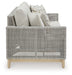 This sofa invites your casual contemporary style outdoors. With its resin wicker in a chic neutral hue, it expertly marries refined design with durability. Breezy summer mornings and cold winter nights are made all the more comfortable with high-performance Nuvella+ fabric covering the cushion.