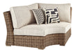 Details Includes 2 armless chairs with cushions, curved corner chair with cushion, left-arm facing loveseat and right-arm facing loveseat, "Left-arm" and "right-arm" describe the position of the arm when you face the piece, All-weather resin wicker handwoven over powder coated rust-proof aluminum frames, Cushions and pillows covered in high-performing Nuvella® fabric, All-weather foam cushion core wrapped in soft polyester, Clean fabric with mild soap and water, let air dry; for stubborn stains, use a solution of 1 cup bleach to 1 gallon water, Imported fabric and fill, Assembly required