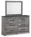 | Details | Includes dresser and mirror, Made with engineered wood (MDF/particleboard/plywood) and decorative laminate for the right balance of affordability and durability, Two-tone look: smoky gray replicated oak grain accented with rustic charcoal finish; replicated oak grain with authentic touch, Charcoal finish over replicated oak grain with authentic touch, Decorative laminate replicates natural or man-made material surfaces with consistent color, pattern and texture, Large-scaled handles in a dark hue, 6 smooth-gliding drawers with dovetail construction, Drawer interiors are lined with a faux linen laminate for a clean, finished look, Framed front and pilasters, Mirror attaches to back of dresser; can also be mounted on wall horizontally or vertically, Safety is a top priority, clothing storage units are designed to meet the most current standard for stability, ASTM F 2057 (ASTM International), Drawers extend out to accommodate maximum access to drawer interior while maintaining safety, Assembly required | |