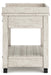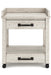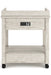 Details Made of pine veneers, pine wood and engineered wood, Distressed whitewash finish, 2 smooth-gliding drawers with dovetail construction, 2 open shelves, Vintage patinated bronze-color hardware, Casters for mobility, 2 electrical outlets and USB charging ports, Power cord included; UL Listed, Assembly required