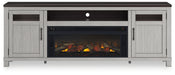 | Details | Includes TV stand and electric fireplace insert, Made with solid acacia wood, cherry veneer and MDF substrates, Glazed light gray painted finish with brown cherry-stained shelves and top, Metal pulls with aged iron-tone finish, Subtle handmade distressing marks for added character and charm, 2 cabinets (each with an adjustable shelf) and single open cubby, Electric fireplace insert provides up to 5,386 BTU/1,500W and warms up to 1,000 square feet; 6-level temperature setting; overheating control device, 5 levels of flame brightness; LED-lit flame operates with or without infrared heat, Realistic-looking log set with dynamic glowing embers; ambient down light with on/off function, Built-in audio speakers with wireless connectivity; touch button controls and remote control, Timer function with programmable ranges from 10 minutes to 9 hours, Power cord included; UL Listed, Assembly required; simply remove the center shelf and back panel to make room for the fireplace insert | |