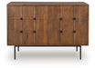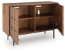 Details Made with solid mango wood, Back made with mango wood veneer and engineered wood substrate, Medium brown finish, 2 push magnet doors, 2 fixed shelves, Openings in back for electronics, Minor assembly required, simply lay flat and attach feet