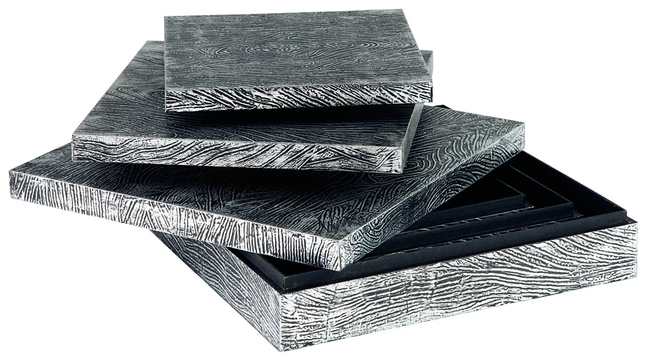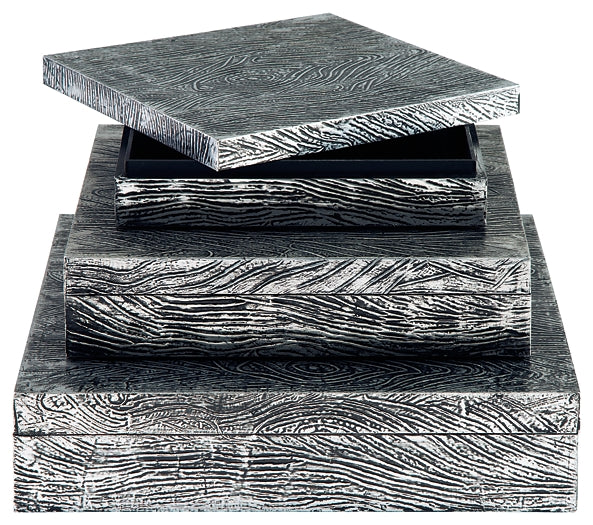 Ideal for a dresser, chest or accent table, this set of three wood and metal boxes is a contemporary choice for the forward-thinking modernist. The antiqued pewter-tone finish is an inspired touch.