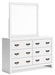 | Details | B427B8: Includes king panel headboard, footboard, rails and slats, Made with hardwood solids, okoume veneer and MDF substrates, White finish, Foundation/box spring required, sold separately, Mattress available, sold separately, Assembly required, B427B1: Includes dresser and mirror, Made with hardwood solids, okoume veneer and MDF substrates, White finish, 6 drawers with dovetail construction and metal center guides, Hardware with dark finish, Drawer interiors are lined with a wood grain laminate for a clean, finished look, Mirror attaches to back of dresser, | |