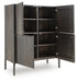 Making a strong contemporary style statement, this accent cabinet transforms storage into a work of art. Rounded flare vertical edges and a rich espresso finish add to its on-trend appeal. Push magnet doors open to reveal six shelves loaded with possibilities. How's that for form and function?