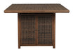 | Details | Accommodates up to 8; bar stools sold separately, Door conceals gas propane tank (not included), Rust-proof aluminum frame with wood-look tabletop, Side panels accented with all-weather, handwoven resin wicker, 56" square fire pit table with CSA-approved 55,000 BTU stainless steel burner, glass beads, burner cover and enclosed storage area with shelves, Battery-operated ignition system with adjustable flame control; battery included, Convertible to natural gas, Gas line or propane tank connector hose not provided, Assembly required, Comes with protective weather cover | |