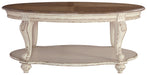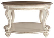 Elevating the art of traditional cottage styling, this oval coffee table is sure to serve you beautifully for years to come. Antiqued two-tone aesthetic blends a chipped white with a distressed wood finished top for added charm. Classic cabriole legs and shapely lower shelf are a lovely twist. Decorative corbels add refinement.