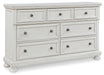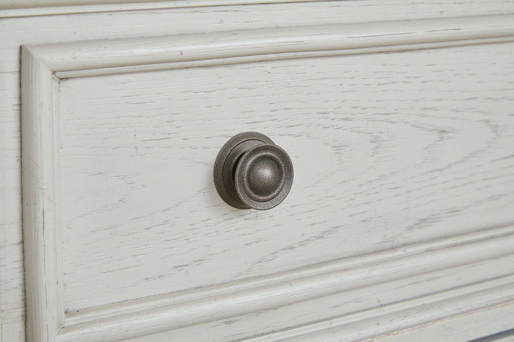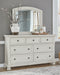 | Details | Includes dresser and mirror, Made with select oak veneer, engineered wood, solid wood components and cast resin components, Antiqued white finish with grain texture, 7 smooth-gliding drawers with dovetail construction and metal ball bearing side glides (pull-out tray and top drawers felt lined), Dark bronze-tone knobs, Mirror attaches to back of dresser, Assembly required | |