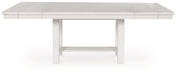 Details Made with rubberwood solids, ash veneer and MDF substrates, Antiqued white finish with grain texture, Tabletop with planked effect, Two 12" removable center leaves, Table extends to 86" overall by pulling both ends and dropping in leaves, Seats up to 8, Assembly required
