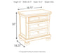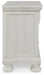 | Details | Made with select oak veneer, engineered wood, solid wood components and cast resin components, Antiqued white finish with grain texture, Dark bronze-toned knobs, 2 smooth-gliding drawers with dovetail construction and ball bearing side glides (pull-out tray and top drawer felt lined) | |