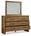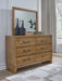 | Details | Includes dresser and mirror, Made with hardwood solids, mango wood veneer and MDF substrate, Light wood-tone finish, 6 smooth-gliding drawers with fully finished interior, dovetail construction and heavy duty ball-bearing side glides (top drawers felt lined) , Metal drawer pulls with darkened bronze-tone finish, Mirror attaches to back of dresser | |