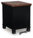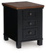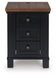 Raise the bar on modern farmhouse style with this chairside end table. Its sturdy silhouette and casual good looks are accentuated with a two-tone finish, which pairs a warm satin black base with a contrasting butcher block veneer top. Spacious storage drawers and dual USB charging ports keep devices powered up and close at hand. Whether your style is vintage, country or eclectic, this table adds a hearty element.